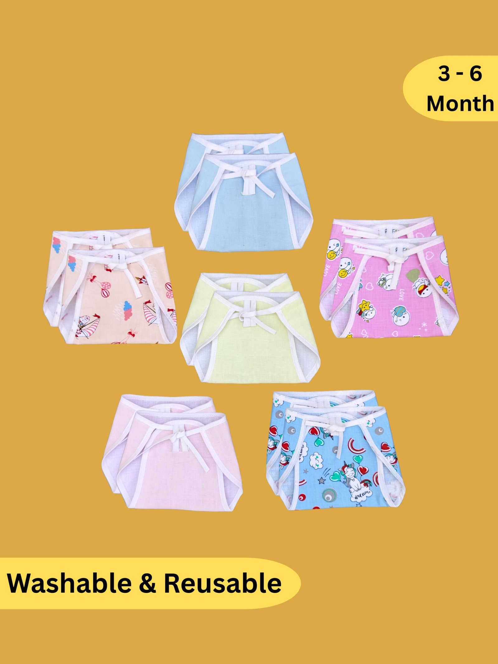 - These “U” shaped cotton cloth diapers are in multicolor with the tie knot Closure type. These washable, reusable nappies are durable, easy to clean, and get softer with every wash.